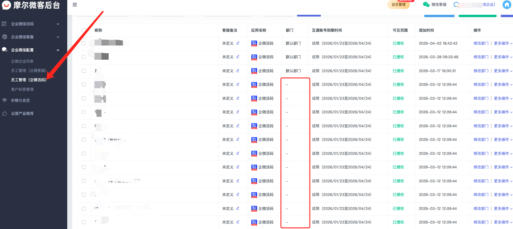 (2)检查员工管理(企微活码)中,刚刚添加的可建联成员部门这一栏是非为“-”,这代表部门这一栏没有设置,修改一下部门(随便设置一个部门)就好。